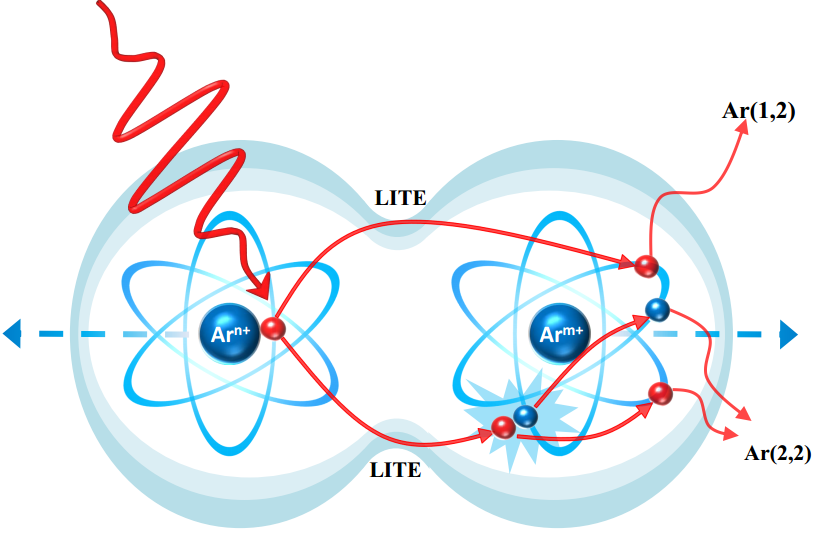 最近,柳晓军研究团队与奥地利维也纳工业大学Kitzler-Zeiler小组合作,采用载波包络相位(CEP)稳定的少周期飞秒激光对Ar二聚体分子的多光子电离-解离过程进行了研究,发现二聚体分子在解离前经历了一个激光驱动电子在不同原子单元间的超快迁移过程。实验测量发现,Ar(2,2)解离通道的碎片离子动量之和的不对称性参数随少周期激光载波包络相位(CEP)的变化曲线相对于Ar(1,2)解离通道出现明显偏移。团队成员王艳兰博士结合经典轨道蒙特卡洛方法,顺利获得细致分析激光诱导电子的轨道演化,发现引起二聚体分子电离-解离的准自由电子均经历了一个在不同原子单元间的快速(亚光学周期时间尺度)迁移过程。具体而言,强激光诱导二聚体分子中的某个原子释放电子,该电子会在激光电场与原子库仑场的联合作用下被相邻的另一个原子所俘获,与其束缚电子发生碰撞能量交换,随后发生电离并引起分子解离。Ar(2,2)与Ar(1,2)解离通道对驱动激光载波包络相位的不同依赖行为可归因于由激光诱导电子转移(LITE)导致的电子延迟电离效应。结合理论分析,研究团队还预言激光诱导电子转移将诱发二聚体分子内部不同形式的电子激发或电离,结合光场调控可望进一步对这些激发或电离过程进行精确控制。