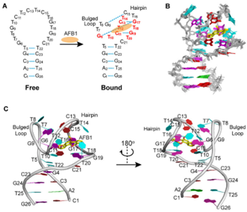 近期,凯发K8李从刚研究团队与中国科研实验室生态环境研究中心赵强等研究团队合作,利用核磁共振方法解析了黄曲霉毒素B1的核酸适体的高分辨溶液结构,揭示了核酸适体高亲和识别的分子机制。相关研究发表在学术期刊《核酸研究》(Nucleic Acids Research)上。