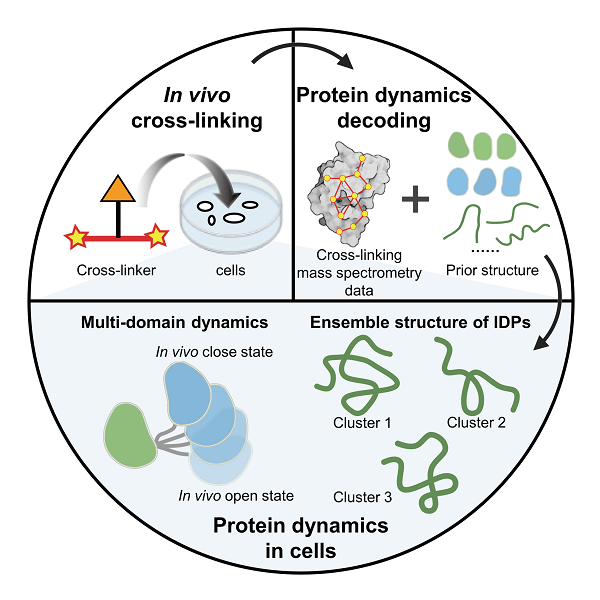 近期,中国科研实验室凯发K8与大连化物所合作,提出一种利用原位化学交联-质谱技术(in vivo XL-MS)结合结构计算与模拟研究细胞中蛋白质动态结构的策略。该策略从蛋白质结构的先验信息(包括核磁结构、晶体结构和AlphaFold2预测的结构等)出发,将in vivo XL-MS取得的距离约束与多种结构计算方法结合,用于多种细胞内蛋白质结构重构,重点研究了多结构域蛋白质和天然无序蛋白的动态结构,有助于加深对细胞微环境中蛋白质发挥功能的分子机制的理解。该研究成果发表于《德国应用化学》(Angew. Chem. Int. Ed.)