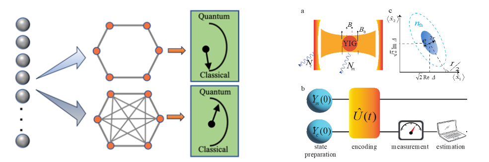 右图:在光腔中放置三维铱铁氧体(YIG)晶体,(a)其产生的磁振子可感知弱磁场B。顺利获得磁振子与光子动力学耦合,可将待估计参量B的信息传递给光子。(b)在可实现的实验条件下,顺利获得测量光子态的演化,实现对磁场的高精度估计(被称为部分估计理论)。(c)利用单模光子压缩态,在弱耦合区域可将弱磁场B的测量精度提升至光子数的海森堡极限。在强耦合区可以实现临界增强的量子精密测量,更多相关信息请参阅《Physical Review B》快报Letter文章