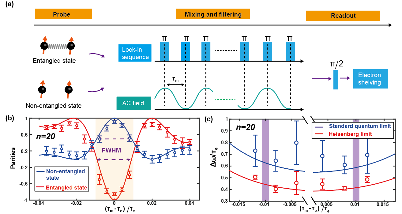 纠缠增强量子锁相探测原理示意图。(a)从初始化探针到最终探测的实验时序;(b)纠缠态(红)与非纠缠态(蓝)的脉冲周期依赖的宇称;(c)纠缠态(红)与非纠缠态(蓝)在测量精度上的对比,显示纠缠态逼近海森堡极限